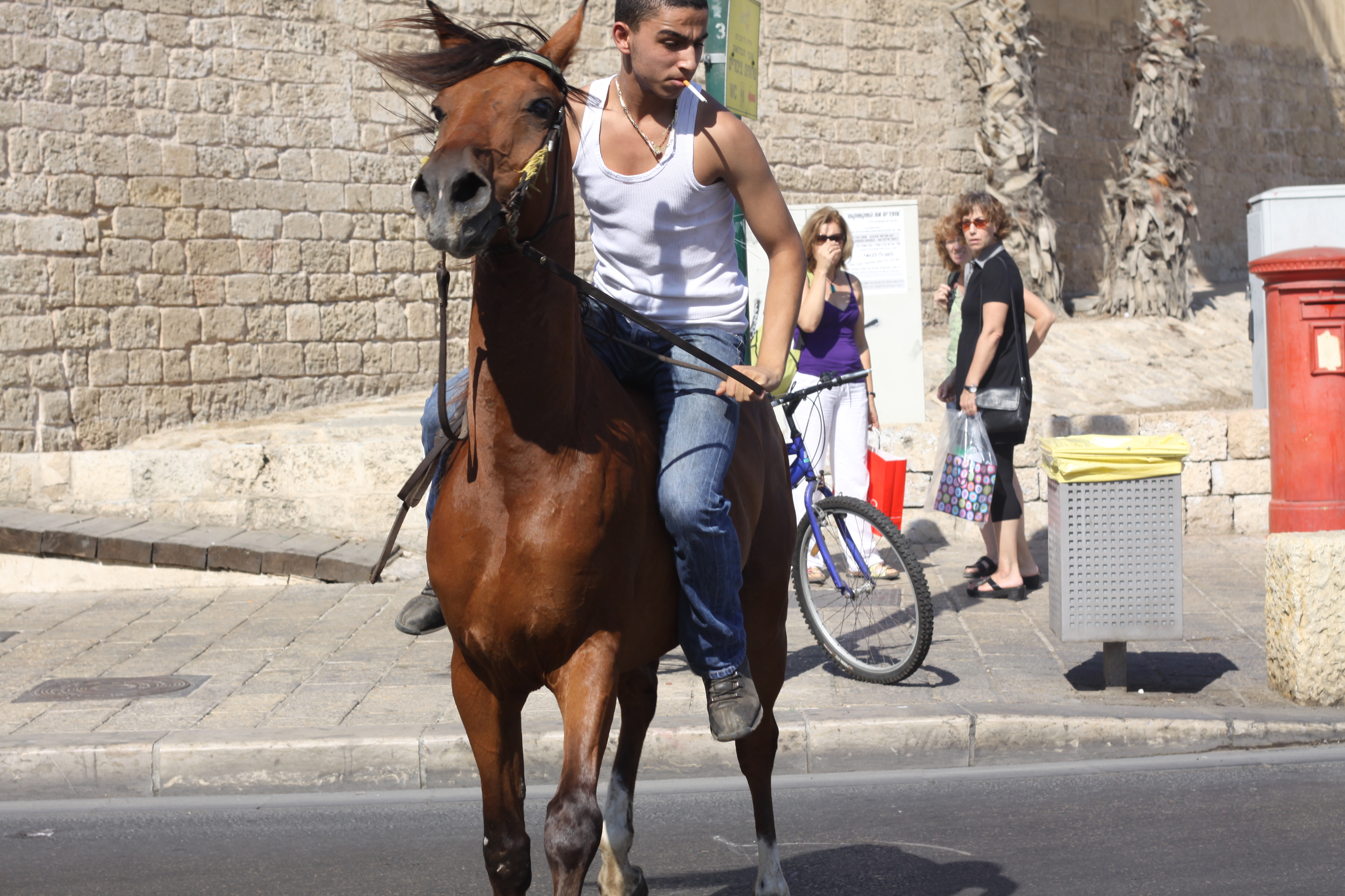 When in Bat Yam, a town on the outskirts of Tel-Aviv, our group was informed that, contrary to what we had been told before, we were not granted permission by Israeli authorities to travel to Gaza. On that same day we took part in an urban tour of Bat Yam / Jaffa with anthropologist Daniel Monterescu at the border between a largely Jewish and a primarily Arab neighbourhood. At one point, a young Arab man suddenly appeared on horseback on one side of a street bordering both neighbourhoods.
