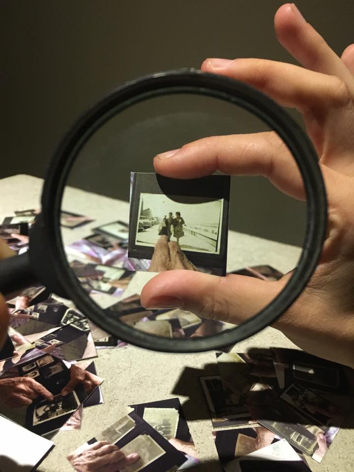 Installation of a projected picture of Maria Matta, a magnifying glass and a number of printed frames from a video recorded by her son, Joaquim Matta. The video depicts Maria Matta, pointing at childhood portraits and saying “here am I”, when the image is clear, and “here I am already fading away” when the image of her face is vanishing.